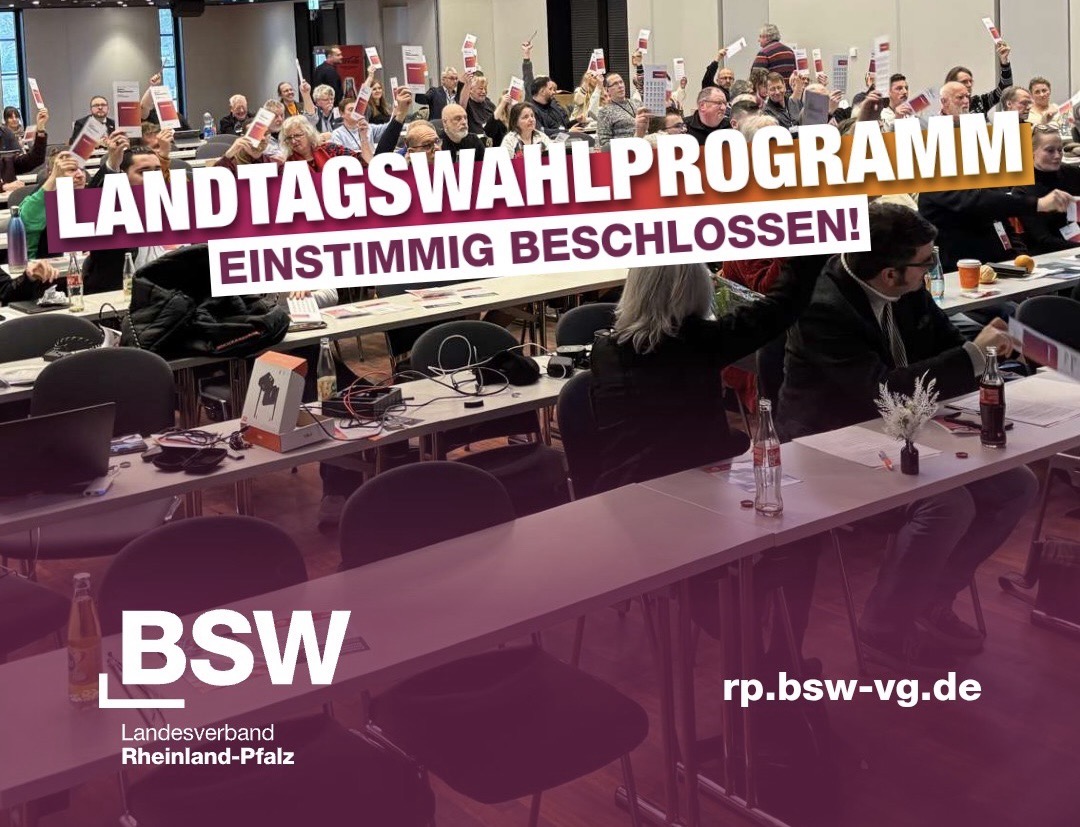 Auch Rheinland-Pfalz braucht einen Neustart. Das Bündnis Sahra Wagenknecht ist unsere Antwort auf eine Politik, die die Interessen der Mehrheit der Menschen in unserem Land ignoriert: Wir kämpfen für Rheinland-Pfalz als Wirtschaftsstandort, für kleine und mittlere Unternehmen, für gute Löhne, für ein faires Bildungssystem, für Renten wie in Österreich, eine flächendeckende Gesundheitsversorgung, den Bau bezahlbarer Wohnungen und die Aufarbeitung des Umgangs mit der Covid-Pandemie.
